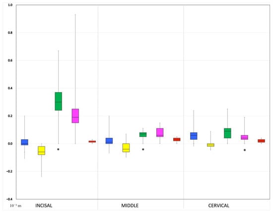 Box-plots showing the linear dimensional accuracy between the 5 groups at the incisal, middle and cervical third. Statistically significant differences compared to control group are marked with *. The whiskers show the range of the obtained values, the outliers, the interquartile range (colorful box) and the median (horizontal black line). The groups have different colors: Blue: Group 1, Yellow: Group 2, Green: Group 3, Pink: Group 4, Red: Group 5 (control).