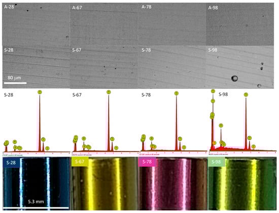 The alloy samples were subjected to anodic oxidation using four voltages, 28, 67, 78, and 98 V. Anodizing at 28 and 67 volts was performed in the H3PO4-based electrolyte, and anodizing at 78 and 98 V was performed in a Na2SiO3 and NH4F-based electrolyte. After that process, oxide coatings of various colors were obtained on the surfaces of the samples (Figure 2). The oxide layers imitated the substrate morphology, practically to a voltage below 98 V, which is typical in the classic anodizing process of titanium and its alloys [17,18]. The morphologies of the samples oxidized at 28, 67, and 78 volts were virtually indistinguishable from each other (Figure 2). The application of higher voltage resulted in the appearance of circular structures, which may have been the effect of adhered oxygen and the beginning of the plasma electrochemical oxidation process (PEO) [19,20].