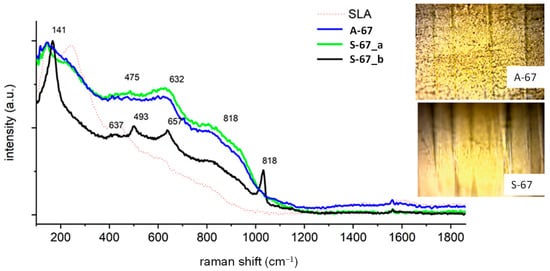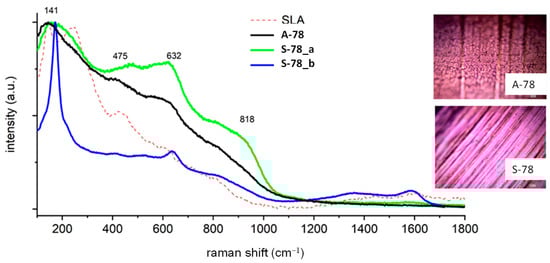 For comparative purposes, in the figures presenting the RM analysis of the obtained samples, the substrate spectrum (SLA) has been drawn with a dashed line. The surface had the same chemical composition, regardless of whether the spectrum was measured at the surface or in the depths of the pores of the sample. The surface composition was a mixture of titanium (IV) oxide in the form of anatase, as evidenced by a very high peak at 144 cm−1, and the presence of signals at 250, 444, and 608 cm−1 is characteristic of rutile TiO2. The spectra also include images taken by optical microscopy, showing the analyzed area of the implants. For sample A-28, the cloud composition of the pores (Figure 3) differs from the sample surface. On the spectrum recorded in the pore A-28_a, there are dominant signals at 1400 and 1600 cm−1 originating from carbon-carbon bonds characteristic for the carbonized organic residue occluded inside the pores of sample A-28. The spectrum A-28_b is characteristic of the material surface, which corresponds to the mixture of amorphous titanium oxides in the form of anatase (peak at 144 cm−1), aluminum oxide Al2O3, and vanadium V2O5; the amorphous nature of the compounds obtained is evidenced by a significant broadening of the signals. Sample S-28, treated with oxygen plasma, had a homogeneous chemical surface, the oxide composition of which was the same as that of sample A-28. There were traces of carbonized organic residue on the entire surface (peaks 1400 and 1600 cm−1), the local content of which was lower than that of sample A-28.