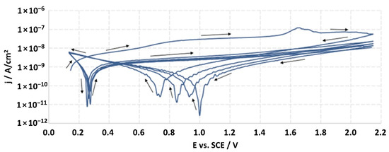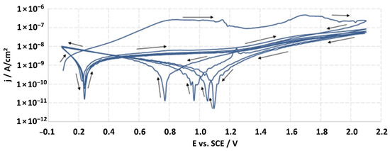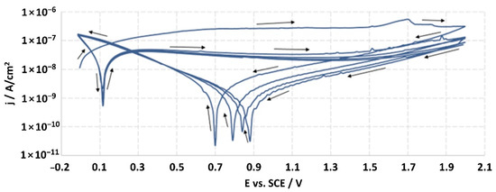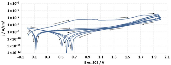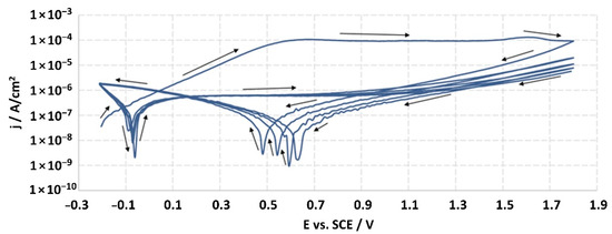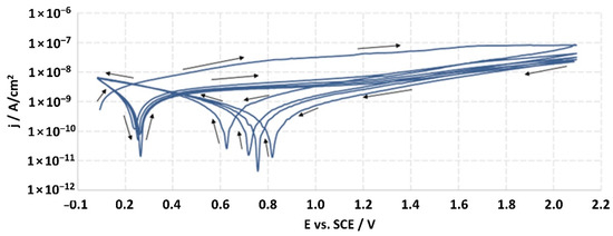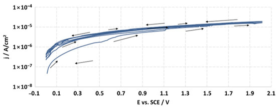 After two hours from the moment of immersion of the working electrode (studied material), the open-circuit potential (EOCP) was measured, and it was the starting potential for potentiodynamic measurements. The sample was tested by linear sweep polarization with a sweep rate of 10 mV/s. The polarization was changed in the range of potential from EOCP to EOCP + 2000 mV, and then the sample was scanned in reverse through the reduction of the potential to the EOCP value. For every sample, the measurement was continued for 5 cycles, which allowed one to achieve the potential of EOCP + 2000 mV. The obtained results were recorded in the half-logarithmic form of the i-E curves. According to the standard, the breakdown potential (Ep) should be defined from the last cycle; however, none of the tested samples were found to achieve this potential. The ISO 10933 standard also provided the measurement at a potential of Ep + 50 mV, but the lack of achieving the Ep value precluded it.
