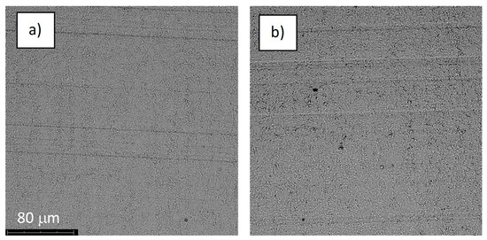 The structure of the surface of sample S-78: (a) before the corrosion test; (b) after the corrosion test; magnification: ×1000.