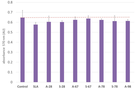 The study was carried out under standard conditions. Cells were obtained from culture bottles by enzyme digestion (trypsin/EDTA), and the cell suspension obtained was centrifuged (200× g, 3 min). The cells were then counted. The density of the cell suspension was 1 × 105 cells/mL. Using a multichannel pipette, cells were dispensed at 100 µL into 96-well plates (1 × 104 cells/well). Before starting the experiment, cells were incubated for 24 h (5% CO2, 37 °C, 90% relative humidity). This incubation time ensured cell regeneration, adhesion, and transition to the logarithmic growth phase. After this time, 100 µL of medium containing the appropriate sample extracts, control, or blank only, was added to each well. The test plates were incubated for another 24 h (5% CO2, 37 °C, 90% humidity). The culture medium was then removed from the plates and 50 µL of 1 mg/mL MTT solution was added to each well. The discs were incubated for another 2 h at 37 °C. After this time, the MTT solution was removed, and 100 µL of isopropyl alcohol was added to each well. Five samples of each material were used to make the extract. The reference wavelength of 570 nm was used to read absorbance on a MultiscanGo reader (Thermo Fisher Scientific, Waltham, MA, USA).