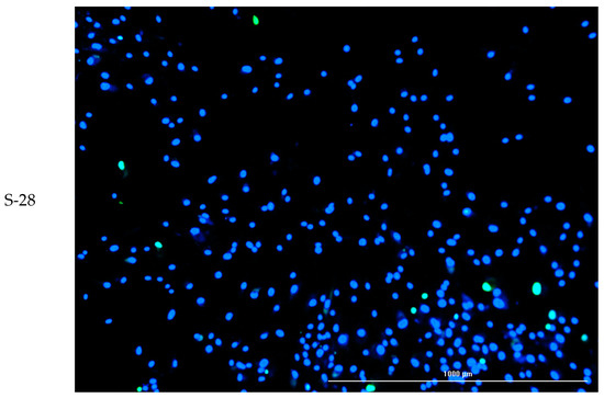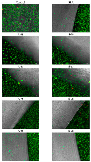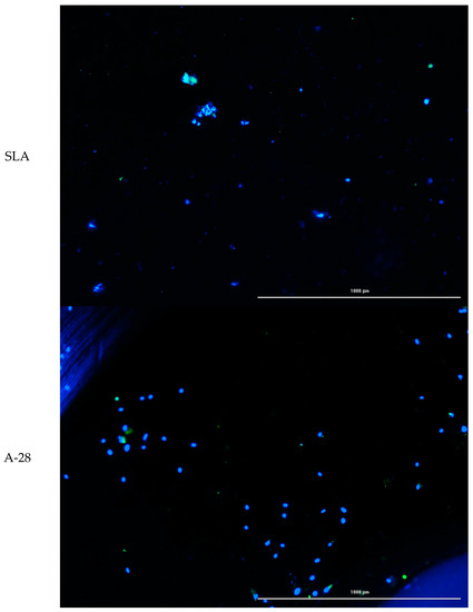 Example of cell growth on the surfaces tested (SLA, A-28, and S-28). Live–dead staining: blue live cells and green dead cells; 10× magnification; EVOS FL microscope.