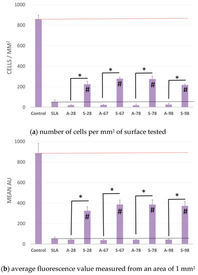 Adhesion and proliferation of human fibroblasts on modified test surfaces after 72 h: (a) number of the cells per mm2 of test surface, (b) mean fluorescence value measured from an area of 1 mm2. * Statistically significant difference (p < 0.05) compared to control (SLA) and between a and s “#” materials.