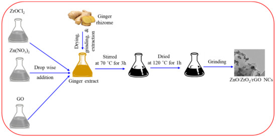Zinc nitrate (Zn(NO3)2.6H2O) (CAS No. 10196-18-6, Millipore-Sigma, St Louis, MO, USA), zirconyl chloride (ZrOCl2.8H2O) (CAS No. 13520-92-8, Millipore-Sigma), and graphene oxide (GO) (Millipore-Sigma) were used as precursors. The 2 mM of zinc nitrate (100 mL) and 0.1 mM of zirconyl chloride (100 mL) were prepared in deionized water in separate beakers. The 0.1 g of GO was also suspended in 100 mL of deionized water with continuous stirring to produce a homogeneous suspension. Then, 50 mL of each solution/suspension (zinc acetate, zirconyl chloride, and GO) were simultaneously added dropwise into 150 mL of ginger extract. The mixture was stirred on a hot plate at 70 °C for 3 h. The resultant mixture was centrifuged, washed with deionized water and desiccated in an oven at 120 °C for 1 h and ground into a fine powder of ZnO/ZrO2/rGO NCs. The ZnO/ZrO2 NCs were prepared by a similar route, without GO suspension. Moreover, pure ZnO NPs were synthesized by the same method without mixing of zirconyl chloride and GO. Figure 1 represented the schematic of the green preparation of ZnO/ZrO2/rGO NCs.