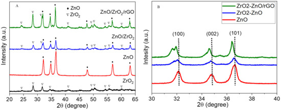 XRD spectra of ZnO/ZrO2 NCs and ZnO/ZrO2/rGO NCs evidently exhibit two different sets of diffraction peaks: ZnO wurtzite structure, and ZrO2 (monoclinic + tetragonal) structure. These spectra suggested the formation of ZnO/ZrO2 NCs. The rGO peaks did not appear in ZnO/ZrO2/rGO NCs, which suggests the ZnO/ZrO2 NCs homogeneously anchored on rGO sheets and prohibited the restacking of sheets. The rGO integration also did not change the crystalline structure of ZnO/ZrO2 NCs. Moreover, an obvious shift of the three main peaks of ZnO (100, 002, and 101) to lower 2θ angle was noticed following the integration of ZrO2 and rGO, which suggests the successful synthesis ZnO/ZrO2/rGO NCs (Figure 2B). These shifts can also be ascribed to the replacement of Zn2+ (0.075 nm) by Zr4+ (0.072 nm) of lower ionic radii [33]. The particle size of prepared nanostructures was calculated corresponding to the prominent peak (101) using the Debye–Scherrer formula [34]. Results showed that crystallite sizes of ZnO NPs, ZnO/ZrO2 NCs, and ZnO/ZrO2/rGO NCs were 25, 20, and 13 nm, respectively (Table 1).