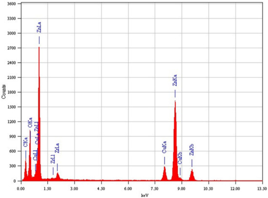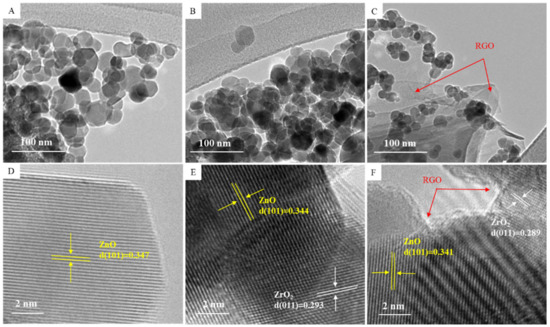 The structural characterization of green synthesized samples was further carried out by FETEM. Figure 3A–C showed the low-resolution micrographs of ZnO NPs, ZnO/ZrO2 NCs, and ZnO/ZrO2/rGO NCs. The morphology of pure ZnO NPs was almost sphere-shaped, with an average size of 23 nm. We noticed that the morphology of the ZnO NPs remained similar, although the size of particles decreases after ZrO2-doping (18 nm) and rGO addition (12 nm) (Table 1). Moreover, ZrO2-doped ZnO particles were firmly attached on rGO nanosheets and acted as spacers to prevent the restacking of nanosheets that enhance the overall surface area of NCs. The reduction of NPs size following metal oxide doping and rGO incorporation was also observed in earlier studies [35,36]. Smaller size and greater surface area of nanostructures is related to an improved therapeutic efficacy [37,38]. HRTEM micrographs of ZnO NPs, ZnO/ZrO2 NCs, and ZnO/ZrO2/rGO NCs are presented in Figure 3D–F. These HRTEM micrographs demonstrated that NPs were highly crystalline and there were good synergisms of ZnO, ZrO2, and rGO with excellent quality of lattice fringes deprived of distortion. The estimated interplanar spacing of adjacent lattice fringes of ZnO, ZrO2-doped ZnO, and ZnO/ZrO2/rGO were 0.347, 0.344, and 0.341, respectively, corresponding to the (101) plan of hexagonal wurtzite crystal of ZnO. These results were in agreement with XRD spectra. TEM-EDS analysis of ZnO/ZrO2/rGO NCs showed the existence of Zn, Zr, O, and C elements without other elemental contaminations (Figure 4). The presence of the Cu peak was due to the use of the copper grid in TEM measurement.