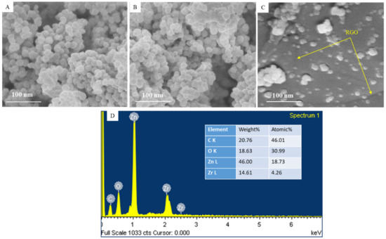 Figure 5A–C show the FESEM micrographs of prepared nanostructures. These micrographs indicated the uniform surface morphology of ZnO NPs, and ZrO2-doping and rGO assimilation did not alter the particles surface smoothness. Moreover, the FESEM micrograph of ZnO/ZrO2/rGO NCs showed that particles were homogenously anchored on rGO nanosheets (Figure 5C). SEM-EDS elemental analysis further confirmed the existence of Zn, Zr, O, and C in ZnO/ZrO2/rGO NCs. The presence of Zn, Zr, O, and C in ZnO/ZrO2/rGO NCs was further confirmed by elemental mapping (Figure 6).