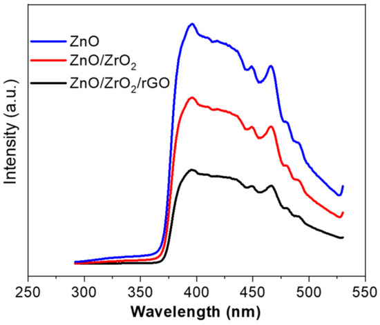 At an excitation wavelength of 290 nm, the PL spectra of prepared nanostructures were recorded and shown in Figure 7. These NPs/NCs display photoemission peaks in both the UV and visible regions. The peak at 395 nm represents near band edge emission and the peaks at 448, 466, 480, and 491 nm correspond to blue emission. The visible emission is related to the zinc interstitials, oxygen vacancies, oxygen interstitials, and surface defects of the synthesized samples [39]. The UV emission peak (395 nm) is generated due to the recombination of free exciton between the valence band and the conduction band of ZnO [18]. Peak intensity of ZnO NPs decreased after the addition of ZrO2 and rGO, which is credited to the reduced electron-hole recombination. This phenomenon is beneficial in improving the anticancer efficacy of semiconductor nanostructures [40]. The reduction of peak intensities further confirms the synergistic interaction between ZnO, ZrO2, and rGO.