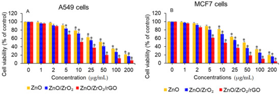 Recent studies highlight the importance of environmentally friendly fabrications of metal oxide nanostructures for biomedical applications [41]. ZnO NPs possess the intrinsic characteristic of selectively killing cancer cells with less toxicity to normal cells, which can be further enhanced by tailoring its physicochemical characteristics [42]. In this work, anticancer efficacy of green produced ZnO NPs, ZnO/ZrO2 NCs, and ZnO/ZrO2/rGO NCs was assessed in human cancer cells (A549 and MCF7). Both kinds of cancer cells were treated with different concentration (1–200 µg/mL) of ZnO NPs, ZnO/ZrO2 NCs, and ZnO/ZrO2/rGO NCs for 24 h, and anticancer potential was examined. Results demonstrated that all three nanostructures induce concentration-dependent cytotoxicity in both A549 and MCF7 cancer cells (Figure 8A,B). The IC50 values of ZnO NPs, ZnO/ZrO2 NCs, and ZnO/ZrO2/rGO NCs are present in Table 2. Anticancer efficacy of ZnO/ZrO2/rGO NCs against both A549 and MCF7 cancer cells was almost 3.5 times higher than ZnO NPs. The high anticancer activity of ZnO/ZrO2/rGO NCs might be because of the excellent synergism between ZnO, ZrO2, and rGO mediated by ginger phytochemicals. There are a number of studies demonstrating the antitumor activity of ginger extracts [22,23]. Tsai et al. observed that 6-Gingerol (a natural phenol present in ginger extract) blocks the proliferation of human lung cancer A549 cells [24]. Another study reported that MCF7 and MDA-MB-231 cells following 6-shogaol (ginger derived bioactive compound) exposure underwent cell death through cell cycle arrest [43]. Therefore, ginger extract mediated green prepared ZnO/ZrO2/rGO NCs raise a hope for their therapeutic potential in cancer treatment. Results of this work agreed with earlier reports that observed the improved anticancer efficacy of ZnO-based nanocomposites prepared through a green route [36,44].