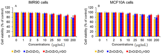 Selectivity is an important issue for anticancer drugs [45]. Therefore, biocompatibility with normal tissues/cells is an essential feature for newly proposed anticancer agents. In this work, cytotoxicity of green produced nanostructures was also estimated in non-cancerous normal cell lines: human normal lung fibroblasts (IMR90) and human normal breast cancer cells (MCF10A). Both types of human normal cells were treated to different concentrations (1–200 µg/mL) of ZnO NPs, ZnO/ZrO2 NCs, and ZnO/ZrO2/rGO NCs for 24 h. As we can see in Figure 9A,B, all three green nanostructures showed good cytocompatibility to both IMR90 and MCF10A cells. Moreover, ZnO/ZrO2/rGO NCs displayed better cytocompatibility than pristine ZnO NPs. These parameters suggest that ZnO/ZrO2/rGO NCs demonstrated augmented anticancer activity and improved cytocompatibility compared to the pristine form of ZnO NPs. Bioactive phytochemicals present in ginger extract that mediated the green synthesis of ZnO NPs, ZnO/ZrO2 NCs, and ZnO/ZrO2/rGO NCs could prevent their side effects on normal cell lines.