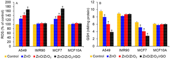 Figure 10. Effect of green synthesized nanostructures on oxidative stress parameters in cancer (A549 and MCF7) and normal (IMR90 and MCF10A) cells. (A) ROS level. (B) GSH level. * p < 0.05 vs. control.