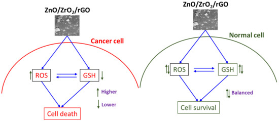 Oxidative stress-mediated possible mechanisms of anticancer activity of ZnO/ZrO2/rGO NCs are represented in Figure 11. The ZrO2 doping and rGO integration create two conclusive changes in the characteristics of ZnO NPs That plays an essential role in the augmented anticancer activity of ZnO/ZrO2/rGO NCs. First, ZrO2 and rGO addition decreases the particle size of ZnO. It is already reported that oxidative stress response nanostructures increase with the decreasing the size of the particles [48]. Second, PL results showed that ZrO2 and rGO reduce the PL spectral intensity of ZnO. Low spectral intensity of ZnO/ZrO2/rGO NCs suggests the recombination rate between electrons/holes pairs (e/h+) was decreased due to the successful splitting of charges. This is an excellent phenomenon for surface redox reactions that can induce ROS generation and oxidative stress in biological systems. Conversely, green prepared ZnO NPs, ZnO/ZrO2 NCs, and ZnO/ZrO2/rGO NCs did not induce oxidative stress in non-cancerous normal (IMR90 and MCF10A) cells (Figure 11). This could be one of the possible mechanisms of the cytocompatibility of NPs/NCs prepared in this study.