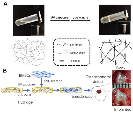 (A) Schematic for synthesizing GelMA/SF composite IPN hydrogels: to create the GelMA–SF IPN hydrogel, the GelMA was mixed with SF solution and crosslinked under UV exposure in the presence of a photoinitiator, following treatment with 70% methanol to induce SF crystallization and (B) in vivo articular cartilage repair study.