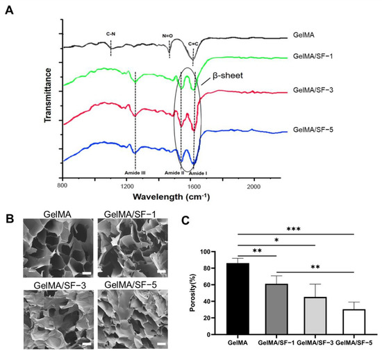 Since it is essential to facilitate the diffusion and exchange of nutrients and metabolic waste of seeded cells by controlling the internal microstructure and porosity, cross-sectional microstructures of hydrogels were examined by SEM. As is shown in Figure 2B, GelMA hydrogels showed a typical highly porous structure. As the SF concentration increased, the composite hydrogels’ microstructures changed from highly porous to semi-lamellar structures, as previously reported, as the typical microstructure of the SF hydrogel [18]. Moreover, SF and GelMA hydrogels had good compatibility with each other, as there were no obvious phase separation phenomena in any of the GelMA/SF IPN hydrogels, similar to a previous study [9]. Porosity analysis based on the captured SEM captured also confirmed the findings (Figure 2C).