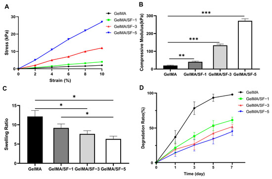 The mechanical properties of the GelMA/SF composite hydrogels were characterized by compressive stress–strain measurements on Universal Testing Systems (Instron 5569, Instron, Norwood, MA, USA) at room temperature. The crosslinked GelMA/SF composite hydrogels were immersed in PBS solution and then compressed at a rate of 0.3 mm/min until failure. The compressive modulus was determined as the slope of the linear region of the stress–strain curve in the 0–10% strain range. Each experiment contains five replicates.