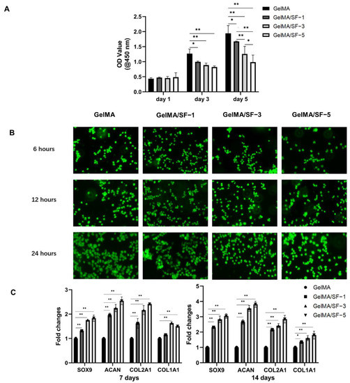 The CCK-8 assay was implemented to quantitatively investigate the proliferation of BMSCs on GelMA/SF composite hydrogels at 1, 3, and 5 days after seeding. As shown in Figure 4A, all hydrogels supported cell growth and showed favorable biocompatibility, as optical density (OD) increased within 5 days in all groups. On day 1, however, there was no statistically significant difference among the groups. However, the pure GelMA hydrogel group showed the highest OD on days 3 and 5, with statistically significant differences among all the hydrogels. In addition, groups with higher SF concentration had lower OD, suggesting decreased cell metabolic activities. Previous studies with similar results suggested that this phenomenon might be related to increased adhesion due to increased GelMA concentration [9,20].