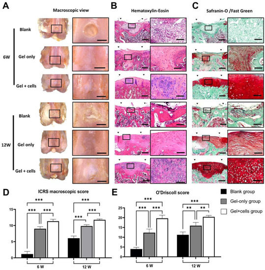 Macroscopic and histological analysis of osteochondral defect repair in vivo. (A) Representative images of macroscopic view of samples in each group at 6 and 12 weeks after surgery. (B) Representative images of hematoxylin-eosin staining. (C) Representative images of safranin-O/fast green staining. (D,E) ICRS and O’Driscoll scores of each group (n = 6). The Gel + cells groups had the highest scores with statistically significant differences at 6 and 12 weeks. Scale bar = 1 mm in (A), 200 μm in (B,C), and 50 μm in enlargement images in (B,C); significant differences symbols: ** = p < 0.01; *** = p < 0.001.
