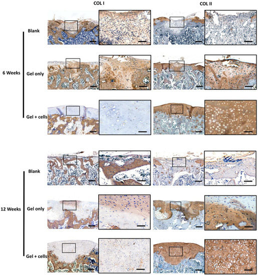 The regeneration was further verified by immunohistochemical staining of collagen type I (COLI) and II (COLII) (Figure 6). The Blank group showed positive COLI staining at 6 weeks and negative COLII staining at both time points, indicating insufficient repair and progressing degradation. The Gels-only group showed consistent results with Safranin-O/Fast green staining, which was inferior to native cartilage. The Gel + cells groups showed strong COLII staining in the cartilage zone and proper COLI staining in the subchondral area.