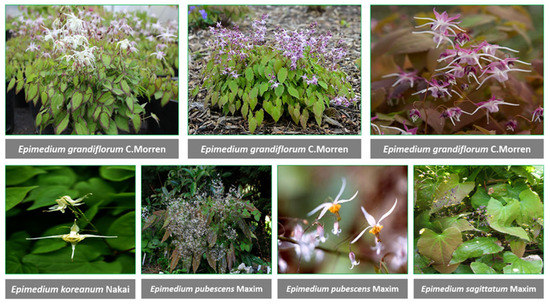 The genus Epimedium L. from Berberidaceae with chief remedial species, comprises a total of 71 species universally [38]. Various species of Epimedium have long been recruited in Chinese medication. Among them, the most popular and commercially important are Epimedium koreanum Nakai, Epimedium pubescens Maxim., Epimedium brevicornu Maxim., Epimedium sagittatum (Siebold & Zucc.) Maxim. and Epimedium wushanense T.S.Ying which is distributed broadly from Japan to Algeria [39,40]. Epimedium taxa grows mostly on cliffs under high humidity, and wet lands at height above sea level ranging from 200–3700 m [39]. Epimedium is a slow-growing herb with leathery leaves and its stems extend beneath the ground. The leaves are different, lengthy-petiolate, ternately divided twice. The pendant-shaped flowers have lengthy spurs and show a discrepancy in color with colorful flowers including four sepals and four petaloides. It has been shown that a lot of species of this plant (Figure 1) have aphrodisiac assets.