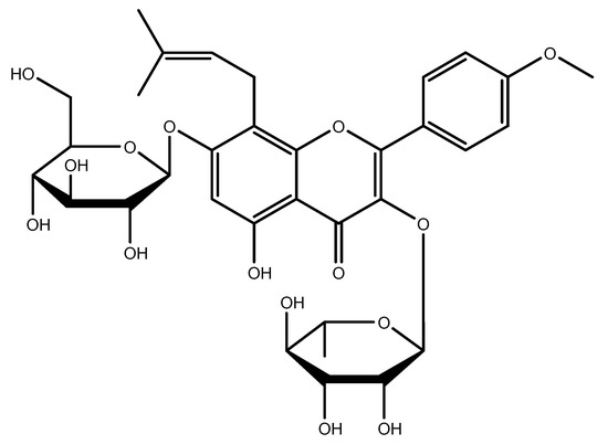 ICRN (C33H40O15, Mw = 676.67) is a type of prenylated flavonoid, showing extensive bioactivities such as antioxidant [44,45,46,47], neuroprotective [48,49,50,51,52], and antitumor [53,54,55,56,57,58,59,60,61] behavior as well as anti-inflammatory responses [62,63,64,65,66,67,68], and can be used to treat erectile dysfunction [69,70,71,72]. It appears it can improve the function of organs including bones and the heart [73,74,75,76,77,78,79,80,81,82,83,84,85,86]. It is crystalline and stable at a low temperature (−20 °C) for approximately two years [87,88,89,90]. The chemical structure is depicted in Figure 2. The stock solutions of ICRN were usually made in DMF or DMSO (20 mg/mL). The solubility of ICRN in organic solvent increases as the temperature increases. To prevent degradation, purging inert gases could be useful. Due to low solubility and stability considerations in water, freshly prepared solutions in the buffer can be used. Usually, a stock solution in DMSO was diluted to increase the solubility in a buffer (the ratio of DMSO to PBS can be 1:10 at pH 7.2) a [87,88,90].