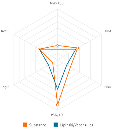 The illustration of the compatibility of substance physicochemical properties with Lipinski/Veber rules component (National Center for Biotechnology Information (2022). PubChem Compound Summary for CID 72302. Retrieved from https://pubchem.ncbi.nlm.nih.gov/compound/72302) (accessed on 1 January 2023).