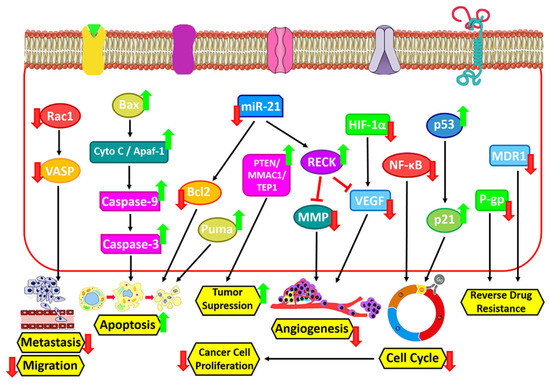 The planned cell death that occurs in the organs of the body is called apoptosis. Biochemical changes including mixing, nuclear disintegration, chromatin density, DNA cleavage, mRNA decay, and eventually cell shrinkage alter cell morphology and other characteristics and cause cell death [131]. ICRN and its derivatives exert their apoptotic effect by activating the innate pathway of apoptosis. ICRN and icaritin increase cytochrome c secretion, Bax/Bcl2 ratio, poly (ADP-ribose) polymerase and caspase stimulation in various types of cancer cells (Figure 4) [132]. MiR-21 is extremely expressed in numerous human tumors and can cause cell proliferation, differentiation and apoptosis, and also play a key role in the formation of metastases in tumors. In a study by Li et al., they showed that ICRN can stimulate caspase-3 activity, block the expression of miR-21, and induce cellular apoptosis in ovarian cancerous cells. Wang et al. represented that ICRN inhibits Bcl-2 protein expression and induces apoptosis in MLTC-1 cells by regulating Bcl-2/Bax expression (Figure 4) [133]. In cancer cells, ICRN significantly reduces the expression of microRNA 21 and the Bcl-2 protein, and increases the expression of PTEN and RECK protein (Figure 3) [134]. According to Sharma et al., however, ICRN treatment noticeably leads to CDK2, CDK4, Cyclin D1, Bcl-2, and Beclin-1 downregulation, it up-regulates the expression ranks of caspase 3 (Figure 4), PARP and p62 [135].
