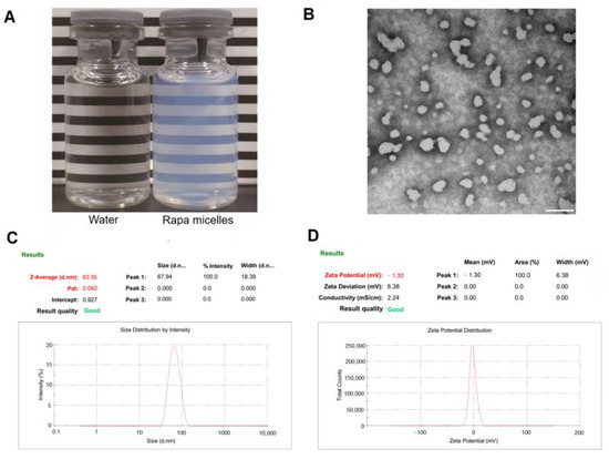 Dynamic light scattering (DLS) is a non-destructive technique to measure molecules at the sub-micron level. The particle size, polydispersity index (PDI), and zeta potential of RAPA micelles were examined by DLS using a Zetasizer Nano ZS90 analyzer (Malvern Instruments Ltd., Malvern, UK). The DLS measurements were performed with a scattering angle of 90° using a laser wavelength of 659.0 nm at the temperature of 25 °C. The micelles used were diluted at a concentration of 1 mg/mL of RAPA.