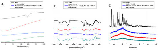DSC, IR, and XRD studies of the free RAPA reagent, PVCL-PVA-PEG, physical mixtures of RAPA and PVCL-PVA-PEG, and lyophilized RAPA micelles were performed. The RAPA thermogram clearly shows an endothermic peak at 195.6 °C (Figure 2A). RAPA’s endothermic peak has been previously reported to be between 183 °C and 205 °C, which corresponds to its melting point [34]. The DSC curve showed that PVCL-PVA-PEG had a relatively mild endothermic peak at 283.3 °C, which was similar to its melting point. For the physical mixture of PVCL-PVA-PEG and RAPA, the melting points of RAPA and PVCL-PVA-PEG remained nearly unchanged. When RAPA was encapsulated into PVCL-PVA-PEG, the endothermic peak of RAPA was absent, whereas the melting range of PVCL-PVA-PEG was extended, indicating the complete embedment of RAPA into the hydrophobic core of the PVCL-PVA-PEG nanoparticles [35].