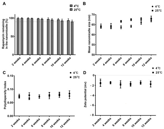 RAPA-NM were prepared and packaged in sterile glass vials for storage stability evaluation. In brief, the samples were kept from light for up to 12 weeks at 25 °C and 4 °C. The particle size, PDI, zeta potential, and amount of RAPA remaining in micelles were determined every 2 weeks [25].
