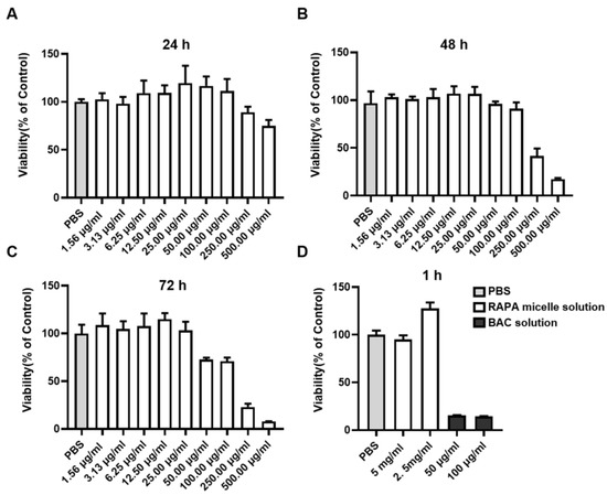 Cytocompatibility examination using MTT assay. Viability of HCECs stimulated for (A) 24 h, (B) 48 h, and (C) 72 h with different concentrations of RAPA-NM; (D) the survival rate of HCECs incubated with different concentrations of RAPA-NM or BAC for 1 h (n = 4).