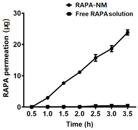 The PAMPA experiment is widely used as an in vitro model for evaluating membrane permeability and transcellular permeation [26,27,28,29,30]. As shown in Figure 5, compared with the free RAPA solution, the RAPA-NM exhibited a strong permeability potential. After 3.5 h of treatment, the levels of permeated RAPA in the RAPA-NM group (23.84 ± 0.83 μg) were considerably higher than those in the free RAPA solution group (0.45 ± 0.01 μg). The membrane permeability of the RAPA-NM was over 50-fold higher than that of the free RAPA solution.