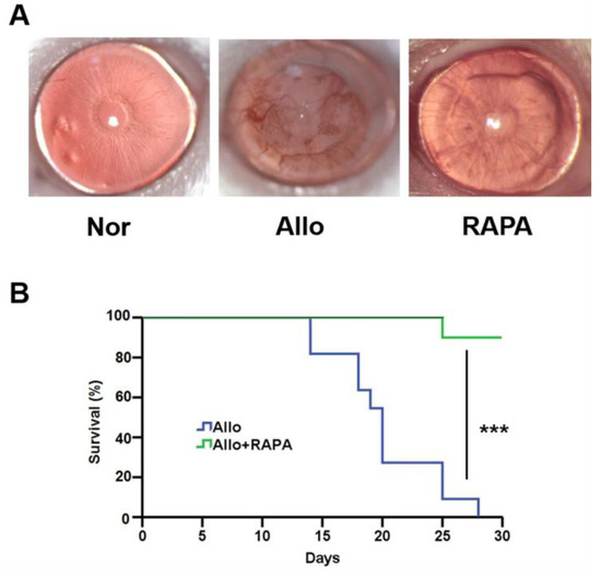 The RAPA micelles were filtered through a 0.22 µm filter for sterilization and were then further diluted with PBS to prepare a 0.1% RAPA nano-micelle ophthalmic solution (1 mg/mL). To explore the anti-inflammatory activity of the RAPA-NM, we established a murine orthotopic penetrating keratoplasty model. In brief, the mice were randomly divided into three groups: a normal group that was not subjected to any procedure (Nor, n = 12), an allogenic corneal transplantation group (Allo, n = 12), and an allogenic corneal transplantation group receiving RAPA-NM (1 mg/mL) four times every day (RAPA, n = 12). Keratoplasty was performed as previously described [31]. In brief, the donor corneas of the C57BL/6 mice were incised by a 2.25 mm trephine to produce a corneal button graft. The BALB/C recipient corneas were excised centrally after being cut with a 2 mm trephine. Then, the donor cornea was sutured onto the recipient graft bed with eight interrupted 11-0 nylon sutures (Mani, Inc., Tokyo, Japan). A 0.3% ofloxacin eye ointment (Suzhou, China) was applied at the end of the surgery. Sutures were removed 7 days postoperatively. Eyes with complications of hyphemia, infection, or cataract were excluded from this study. Cornea status was graded for graft survival using slit lamp microscopy according to a previous criterion [32].