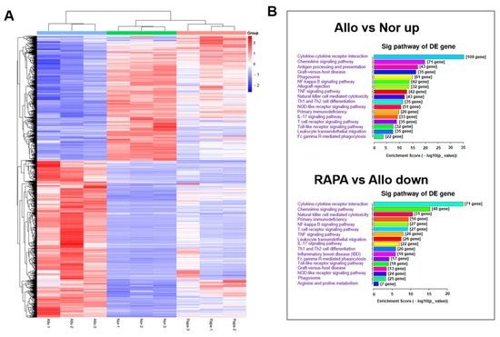 A corneal transplantation model was established to investigate the anti-rejection effect of RAPA-NM and to elucidate the underlying mechanism through transcriptomic analysis. Compared with the untreated corneal allografts (Allo group), the RAPA-NM-treated allografts (RAPA group) showed significantly reduced allograft rejection, longer survival time, and nearly transparent corneas (Figure 6). Based on these findings, corneal grafts were harvested from different groups for transcriptomic analysis and subsequent mechanism investigation. The principal component analysis (PCA) revealed that the samples obtained from the Nor, Allo, and RAPA groups could be separated into three clusters based on their gene expression profiles (Supplementary Materials, Figure S2). Compared with the Nor group, the Allo group had a total of 3383 DEGs, of which 1951 were upregulated and 1432 were downregulated (Supplementary Materials, Figure S3). Compared with the Allo group, the RAPA group had a total of 737 upregulated and 1058 downregulated genes. The clustering heatmap analysis revealed the significant discrepancy among these groups in terms of their gene-expressing profiles (Figure 7A).