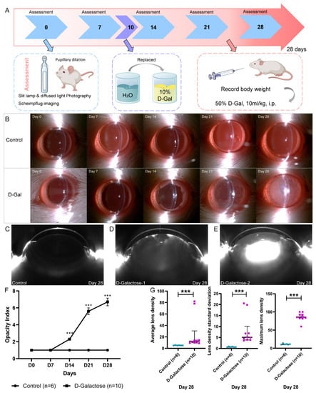 All rats were weighed daily and intraperitoneally injected with 10 mL/kg 50% D-galactose (Maklin, G6223, Shanghai, China) that was prepared in a 50 mL centrifuge tube (NEST Biotechnology, Cat. No. 602052, Wuxi, China). From day 10, the drinking water was replaced with 10% D-galactose water. A total of 28 days were required to establish the rat model of D-galactose-induced cataracts. On days 0, 7, 14, 21, and 28, the rat pupils were dilated with topical tropicamide (5 mg/mL)/phenylephrine (5 mg/mL) eye drops. We then examined the rats using a slit lamp (TOPCON, Tokyo, Japan) and Pentacam 70700 (OCULUS Optikgeräte GmbH, Wetzlar, Germany) to assess lens opacity.