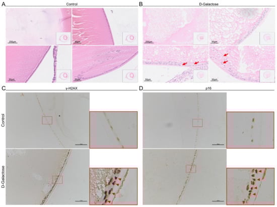 Age-related cataracts are associated with increased numbers of senescent LECs [,], and a previous study reported that D-galactose induces LEC senescence []. Therefore, we examined senescent LECs in D-galactose-induced cataracts. Compared to control lenses, fibers of lenses exposed to D-galactose were collapsed and replaced by an amorphous substance (Figure 2A,B). The structure of the lens epithelium became multilayered and disorganized. In addition, LECs became enlarged and distorted with increased vacuoles, which are regarded as morphological characteristics of senescent cells []. p16 and γH2AX, which are involved in CDK-associated cell cycle arrest and DNA damage response, respectively, are often used as specific markers of senescence []. Therefore, we examined the expression of these two markers in LECs. We observed that γH2AX+ and p16+ LECs accumulated in D-galactose-treated lenses, and the expression level of γH2AX also increased (Figure 2C,D), indicating LEC senescence. These results suggest that the number of senescent LECs is increased in D-galactose-induced cataracts.