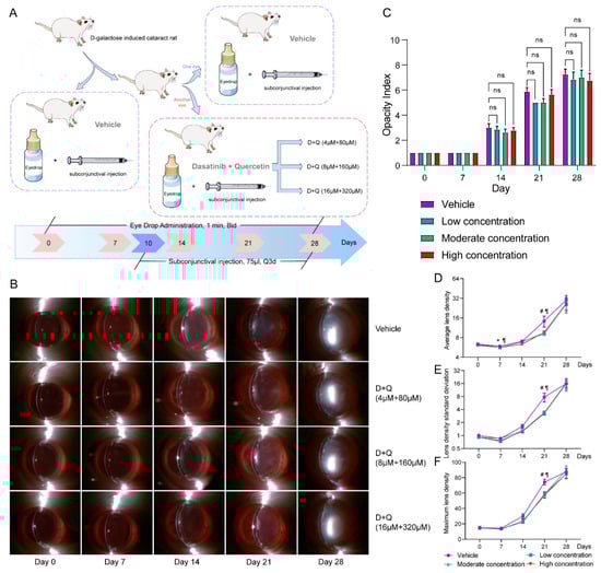 D+Q alleviate cataract progression at the early stage. (A), Flowchart of the D+Q administration. (B), Anterior segment photographs of cataract lenses in the D+Q and vehicle groups. (C), Changes in opacity index in the D+Q and vehicle groups. (D–F), Changes in average lens density, lens density standard deviation, and maximum lens density in the D+Q and vehicle groups. *, vehicle vs. low D+Q concentration (p < 0.05); #, vehicle vs. moderate D+Q concentration (p < 0.05); ¶, vehicle vs. high D+Q concentration (p < 0.05); ns, not significant; D+Q, dasatinib plus quercetin.