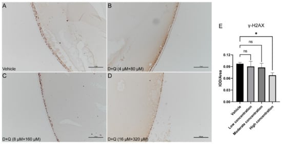 Next, we performed IHC stainings for p16 and γH2AX in these lenses. Compared to vehicle-treated lenses, the expression level of γH2AX decreased gradually with the increase in D+Q concentration, especially for the high D+Q concentration (Figure 4A–E). The expression level of p16 was also slightly reduced after D+Q treatment (Figure S6A–E). Furthermore, we compared both eyes in each rat, and no significant differences in p16 and γH2AX expression were found (Figure S7A–F).