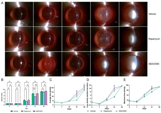 SASP-related cytokines and chemokines are secreted by senescent cells, and this can accelerate inflammation and disease progression []. As we noticed that the therapeutic D+Q effects disappeared on day 28, which we considered to be caused by a breakdown of the LEC barrier after the elimination of senescent LECs, we tried to inhibit SASP-associated changes. We used two SASP inhibitors (rapamycin and SB203580) to treat D-galactose-induced cataracts and found that rapamycin significantly alleviated lens opacity (Rapamycin vs. vehicle, adjusted p value < 0.0001) (Figure 5A). Opacity indexes, as well as ALD (Adjusted p value = 0.088), LDSD (Adjusted p value= 0.119), and MLD (Adjusted p value = 0.220) values of rats in the rapamycin group were lower than those in the vehicle-treated group on day 21 (Figure 5B–E). However, these effects disappeared on day 28. Another SASP inhibitor, SB203580, is a p38 inhibitor that has been shown to have a higher ALD at day 28 (Adjusted p value = 0.027); no statistical significances were found for opacity index, LDSD, and MLD (Figure 5A–E). Comparisons between treated and untreated eyes from each rat are displayed in Figure S8.
