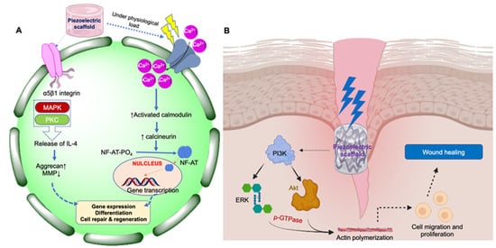 Schematic representation of cell signaling pathways through which piezoelectric materials elicit their action in tissue repair and regeneration. (A) Calcium/calmodulin pathway in bone, cartilage, and tendon; (B) PI3K-Akt-based signaling pathway for wound healing in skin.