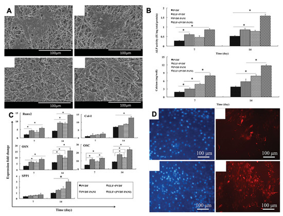 (A) SEM images of DPSC-seeded electrospun PVDF scaffold after PEMF exposure; (B) Alkaline phosphatase and calcium content assays of the differentiated DPSCs under osteogenic medium; (C) Different relative gene expression of DPSC-seeded electrospun PVDF scaffold at 7 and 14 days in the absence and presence of PEMF, the significant differences (p < 0.05) between groups are indicated with * sign; (D) Immunocytochemistry (ICC) staining for osteocalcin protein in the differentiated DPSCs. Reprinted with permission from [56]. Copyright 2019 [56], Taylor & Francis Online, with minor modifications.