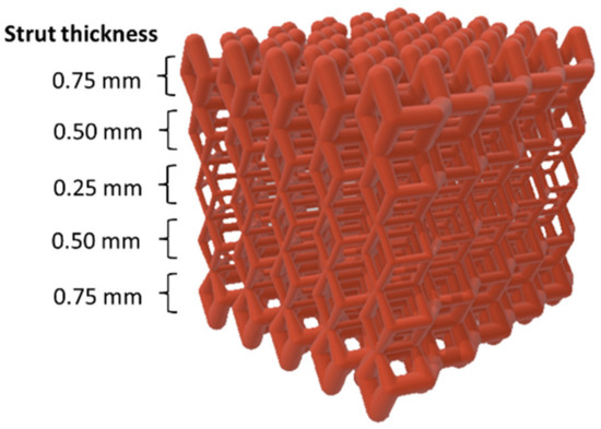 The same dense-out (DO) graded lattice geometry adopted in our previous work on 316L SS [15] was used in this experimental work (Figure 1). Cubic scaffolds with 10 mm sides with a total scaffold volume Vs. = 1000 mm3 were obtained by repeating in space a rhombic dodecahedral (RD) elementary unit cell. The graded structure was achieved by varying the strut size of the elementary unit cell layer by layer along the scaffold building direction. Values of strut thickness were in the range of 0.25–0.75 mm, with a step size of 0.25 mm. Strut size increased from core to edge, and the geometry was built in specular symmetry from the central horizontal axis. Thus, the scaffold was composed of a total of five layers (Figure 1). The values from STL files of the total volume of material (VmSTL) and porosity (PSTL) were respectively VmSTL = 280 mm3 and PSTL = 72%.