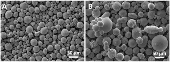 FESEM images of the virgin new powder (PF53) and residual powder in the chamber after scaffold production (PF53R) are shown in Figure 2. PF53 mainly exhibited spherically shaped particles with a size in the range of 5 ÷ 50 µm and some satellite particles partially melted on the surface of the larger ones (Figure 2A). On the other hand, the PF53R powder showed more irregular particles resulting from the aggregation of melted or partially melted particles (Figure 2B). The size of particles in the PF53R powder ranged from 5 to 130 µm.