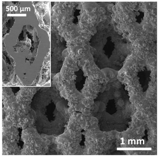 The surface morphology of the SF53 scaffold is shown in Figure 3, along with a detail of the inner structure after cutting the scaffold at half height (inset in Figure 3). Powder particles remained partially melted on the struts, while pores were free of residual powder (Figure 3). The size of particles of the residual powder on the scaffold surface was smaller than the size of the particles of the virgin new powder, due to their partial melting during the LPBF process. The SEM image in the inset of Figure 3 reveals the presence of closed micro-pores within the struts.