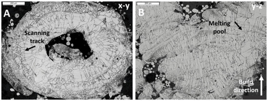 Optical micrographs of SF53 microstructure: (A) x–y plane—scanning track of laser is indicated by a black arrow; (B) y–z plane—laser melting pool is marked with a black arrow, while the build direction is marked with a white one.
