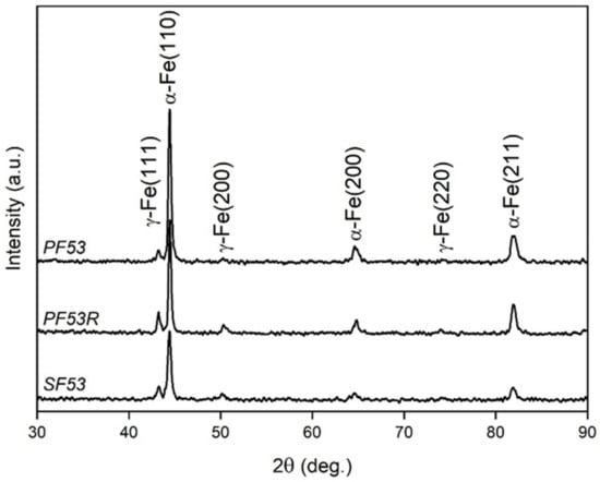 XRD patterns of all the investigated samples are reported in Figure 5. The patterns in Figure 5 are vertically translated to ease comparison. Peaks revealed the presence of the γ-Fe (austenite) face-centered cubic (fcc) phase (ICDD 33-397) with nominal lattice parameter a = 0.35911 nm and the α-Fe (ferrite) body-centered cubic (bcc) phase (ICDD 6-696) with nominal lattice parameter a = 0.28664 nm.