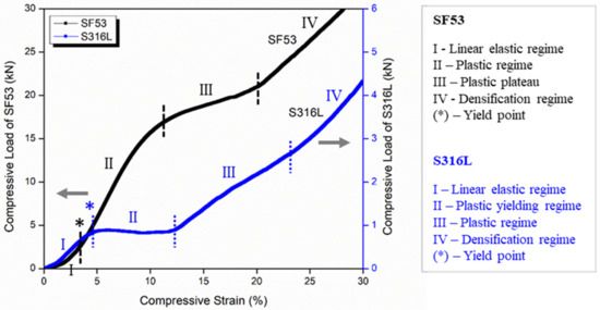 Figure 6 highlights the different mechanical behavior of the SF53 and S316L scaffolds under compressive load. In the compressive curve of S316L, four different regimes can be recognized: (I) elastic; (II) plastic yielding; (III) plastic; and (IV) densification. On the other hand, the initial linear behavior of SF53 (I) is followed by the plastic regime (II), until reaching a plateau around 20 kN of load (III). After this, the compression curve of SF53 shows a densification regime (IV).