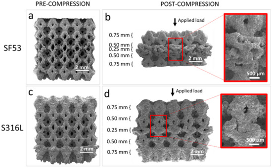 The failure mechanisms of the SF53 and S316L scaffolds were observed by SEM (Figure 7). SEM micrographs of SF53 before (Figure 7a) and after (Figure 7b) mechanical compression tests clearly shown that the plastic deformation of the scaffold first involved the elementary cells with the smallest strut size (0.25 mm). SEM observations of S316L before (Figure 7c) and after (Figure 7d) compressive test are reported in Figure 7 for comparison.