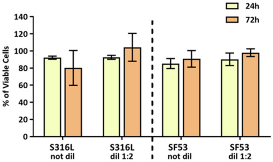 The results of indirect cytotoxicity assessment are shown in Figure 8. The influence of conditioned mediums (CMs) derived from the S316L and SF53 scaffolds on MG63 viability was investigated by MTT assay after 24 and 72 h of incubation (Figure 8A). No significant differences were detected between non-diluted and diluted CMs, as well as between SF53 and S316L.