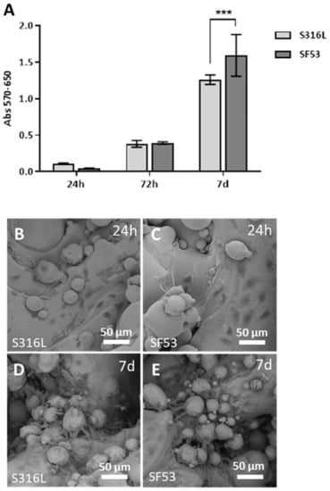 Viability of MG63 cells seeded on the S316L and SF53 scaffolds: (A) MTT assay results at 24 h and 7 days. Data are expressed as Absorbance 570–650; (B–E) cell morphology on S316L and SF53 after 24 h (B and C, respectively) and after 7 days (D and E, respectively; *** p < 0.001).
